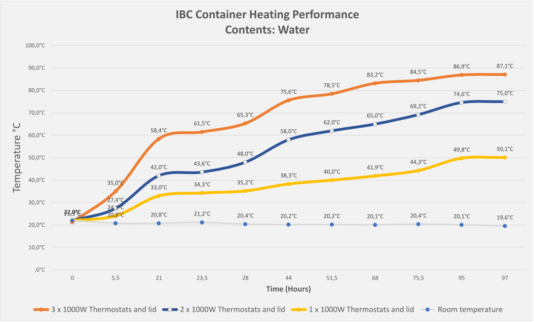 - Fűtés - fűtőköpeny és fedél - 1000 literes tartály vízzel +15°C-tól +30°C-ig: